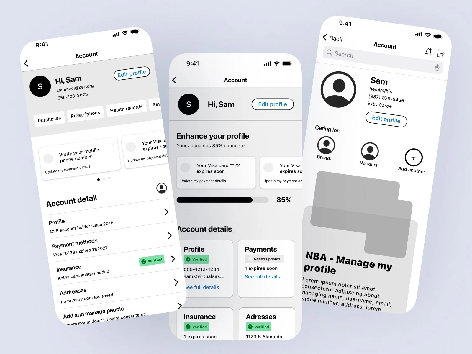 We aimed to involve other teams in shaping the direction of this work. This redesign was significant as it would be our first major overhaul, including the addition and removal of lines of business from the account screen. Consequently, collaboration with various teams was crucial. Meanwhile, I concentrated on the connecting screens under the Account Management category: Profile, Sign-In and Security, Address, Communication Preferences, and Data Privacy.